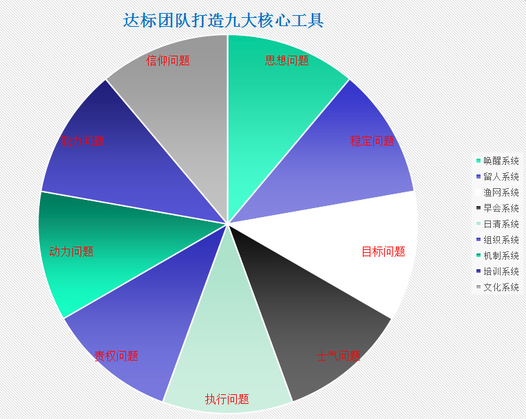 | 高效執(zhí)行力 | 早會(huì)系統(tǒng) | 早會(huì)集全日的管理于10-20分鐘之內(nèi),全方位地對每個(gè)人、每件事進(jìn)行清理和控制,達(dá)到改善員工精神面貌,創(chuàng)建組織學(xué)習(xí)文化,建立相互檢查、監(jiān)督考核機(jī)制,聚焦公司品牌文化引導(dǎo)企業(yè)行為, 提高核心競爭力。 |